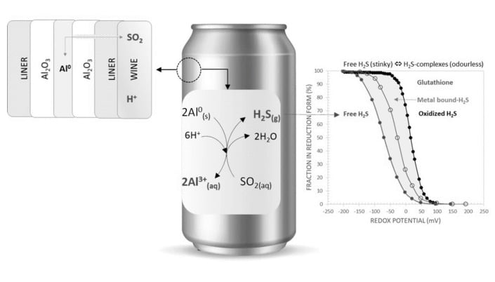 El vino y sus derivados en lata pueden presentar defectos organolépticos si no se manejan con cuidado ciertos aspectos durante su elaboración. En primer lugar, tener en cuenta que el producto dentro de la lata está separado del metal (aluminio) por un recubrimiento interno llamado liner. Si ese liner se mantiene intacto, la lata se comporta bastante parecido al vidrio… con una gran diferencia: es un sistema muy cerrado, entra muy poco oxígeno. Y eso puede jugar a favor (menos oxidación) o en contra (más tendencia a desarrollar perfil reductivo). Uno de los problemas del vino en lata es el olor a huevo podrido (H₂S). ¿De dónde sale? Dos caminos: (1) el vino ya venía con potencial reductivo (H₂S/tioles latentes, a veces ligados a cobre) y, como hay poco oxígeno, se expresa y persiste; (2) si el liner se daña, aparecen micro-zonas donde el vino toca metal y se desencadenan reacciones que favorecen la formación de H₂S, especialmente cuando el SO₂ molecular es alto. El SO2 oxida el aluminio metálico (corrosión) y al mismo tiempo se forma el H2S. Por eso se hace muy necesario controlar variables del vino y del proceso. Los cloruros y el cobre no son un problema si el liner está perfecto, pero si hay micro-defectos aceleran las picaduras y su consecuente corrosión. Además, ciertos ácidos orgánicos como el cítrico o málico pueden complejar aluminio si hubiese migración, desplazando la reacción en favor de la propia corrosión (la imagen del post fue extraída del paper de A. Versari). Por lo tanto lo recomendado sería: elegir un liner adecuado (epoxy suele ser mejor que acrílico), controlar SO₂ molecular (más que solo SO₂ total), minimizar uso de cobre en el proceso y evitar cloro en limpieza. Nota: para mayor información nos podes contactar a cursos@capacitacioneselmolino.com Carien Coetzee, THE WINEMAKER’S GUIDE TO WINE IN A CAN, 2021. Andrea Versari y cols, Packaging of Wine in Aluminum Cans – A Review, American Journal of Enology and Viticulture, 2023.
